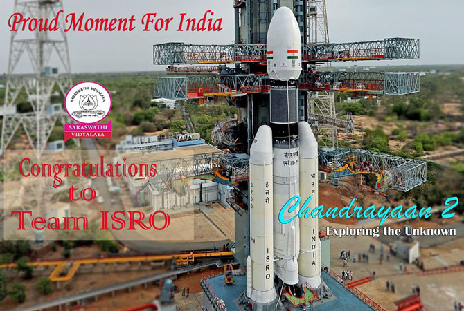 Saraswathi Vidyalaya congratulates all Indians for the historic launch of Chandrayaan 2 and wishes the mission great success in the landing and exploration of the Lunar South pole an area as yet not attempted by anyone else in the world. We are very proud of everyone at team ISRO who have achieved this feat with sheer hard work and perseverance. We would specially like to mention the following scientists at team ISRO who have made Kerala proud. They are Mr. M Bhasheer, Mr.S Somanath, Mr.Kunzi Krishnan, Mr.J Jayaprakesh, Mr.K C Ragunatha Pillai, Mr.P M Abraham. Lastly it gives us immense joy to point out that Mr.K C Reghunatha Pillai is the husband of our physics faculty Mrs.Sushama M S. Thank you Sir. Your achievements will surely motivate the young minds of our School and inspire them to literally touch the moon in times to come.
