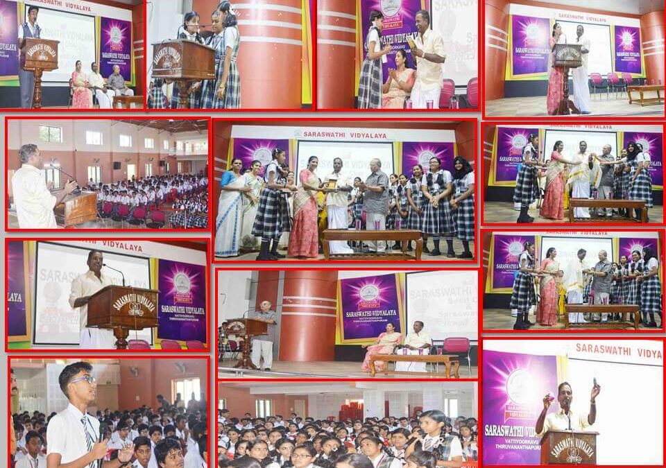 To commemorate the formation day of Kerala on November 1, a special assembly was conducted to highlight the significance of this day. SEED club and Saraswatham club honoured Karshakasree Awardee Shri.Natarajan in a special programme conducted in the activity hall. He was honoured by Dr.G Rajamohan, Chairman Saraswathi Vidyalaya with a Ponnada and presented a momento by Mrs.Devi Mohan, Secretary Saraswathi Vidyalaya. In the interaction with the students, Shri.Natarajan explained the need for organic farming and the benefit of it to our environment , health and society. Folk songs were rendered by the students describing the glory of Kerala.