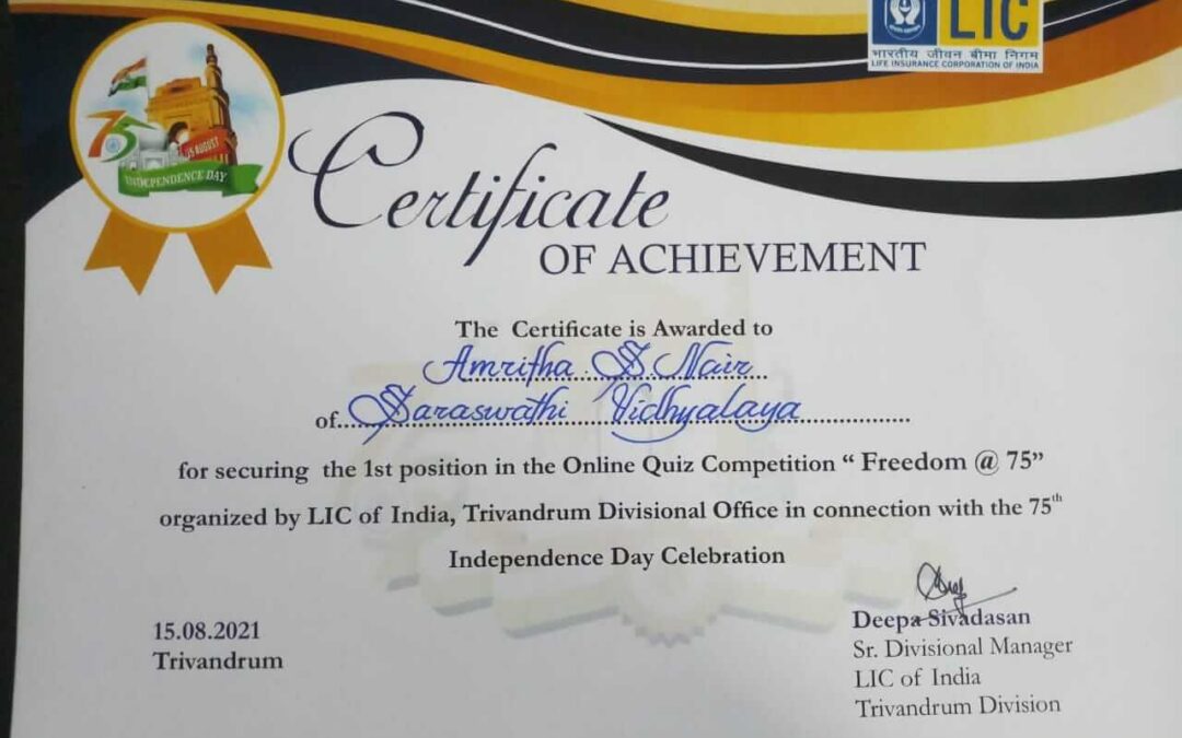 In connection with the 75th Independence Day Celebrations, LIC of India Trivandrum Divisional Office conducted an Online Quiz Program “India @ 75” for students of Class VIII, IX and X on 14.08.2021. Students from various schools in the district participated and Amritha S Nair of Class IX D from our school emerged as the winner bagging the cash award of Rs.3000. We congratulate our student and are very proud of this achievement.