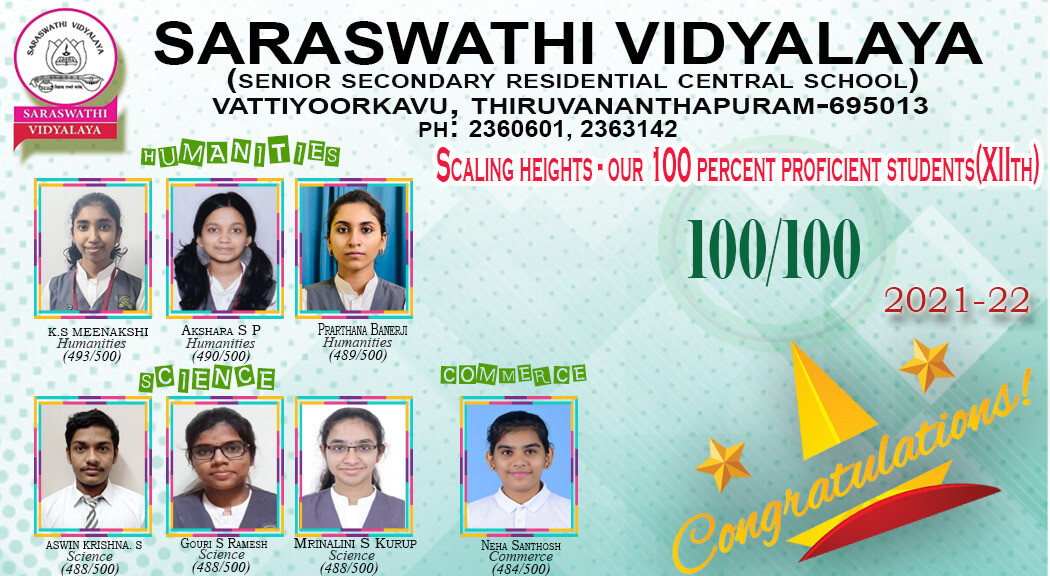 History repeated itself when once again Saraswathi Vidyalaya, Trivandrum emerged winners hands-on in the CBSE class 12 examination. Out of the 323 students who appeared for the examinations, 314 students got first class, 211 got distinction and 57 students scored above 90 %. Meenakshi K S of Humanities stream is the school topper with 98.6%, Gouri S Ramesh, Mrinalini S Kurup and Aswin Krishna topped the science stream with 97.6% and Neha Santhosh was the topper in the commerce stream with 96.8%.