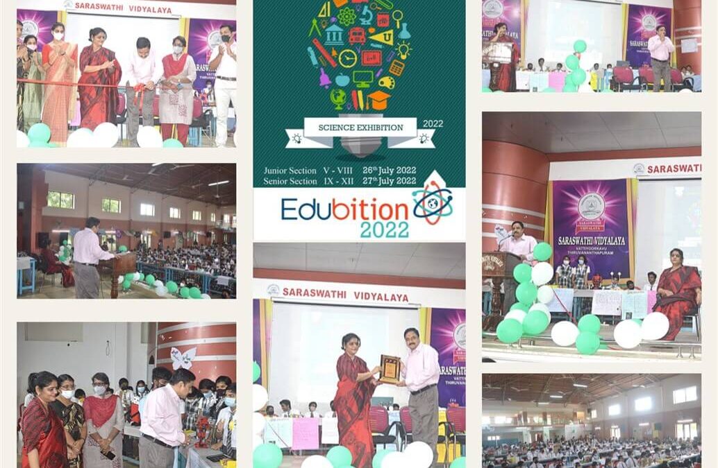 Edubition – Invention, Innovation &Implementation, the Science Exhibition organized by the Science department of Saraswathi Vidyalaya was inaugurated by Dr. Madhavan Nampoothri K, Senior Principal Scientist, CSIR on 26 July 2022. The two day exhibition will have different innovative models and will go towards the aim of fostering the scientific temper of students. Mrs Shylaja O. R. , Principal while thanking the Chief Guest also congratulated the Science Department and students for this endeavour. Dr Arun Surendran, Principal Trinity Engineering College and Dr Devi Mohan, Vice Chairperson visited the science exhibition and appreciated students efforts in building many creative scientific models.