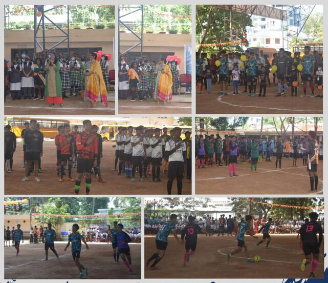PELIGA-2K22- INTER DEPARTMENTAL FOOTBALL TOURNAMENT The much anticipated Peliga-2K22, the inter-depatmental football tournament organised by class XII Physical Education Students, got off to a colourful start on the 29th July 2022. The inaugural function had our tiny tots from the Kindergarten section who came with balloons and marched in with the particiating teams. Students from senior school followed it with a very energetic dance performance. The inauguration came to an end with Dr Devi Mohan, Vice Chairperson and Mrs Shylaja O . R , Principal kicking the ball into the goal post. The enthusiasm on the field was one to see with students giving it their best after getting back to active competitions after nearly two years. El Fugo (Dept of Computer Science) defeated Black Devils by a margin of 1-0 in a thrilling final on 30th July 2022. Other prizes were as follows- Best goal keeper-Yasin XII C Top Scorer- Nandu Krishnan XII B Fair Play Team- Forca Best Jersy- Forca. Mrs Shylaja O. R. Principal handed over the trophy to the winning team and distributed the other prizes as well.