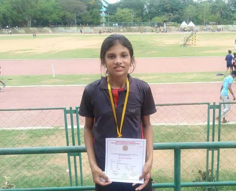 At the District Athletic Championship, Niranjana V of Std VI C won a gold medal for 100 m and a bronze medal for 50 m sprint respectively in the under 12 category. We congratulate our student and may her aspirations of doing better be fulfilled.