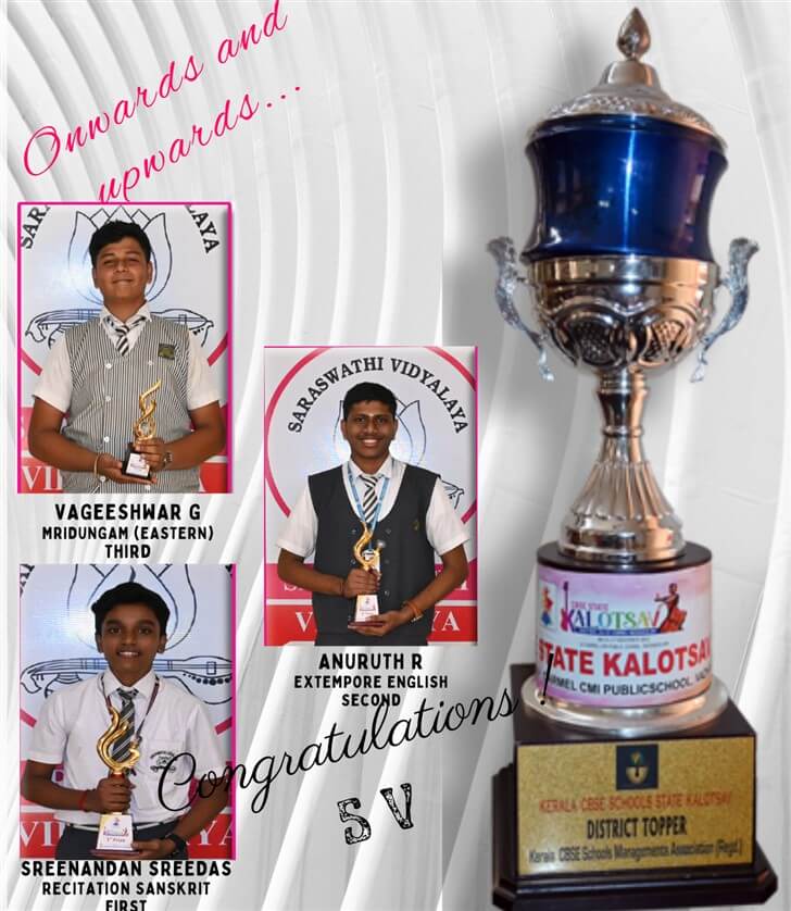 Saraswathi Vidyalaya won a massive victory in the Kerala State CBSE Arts Festival by placing first at the district level. Saraswathi Vidyalaya took the first position in the district and fourth place in the Kerala State CBSE Arts Festival, held from November 24 through 27, 2022. The ecstatic pupils of Saraswathi Vidyalaya have now accomplished this coveted feat twice.